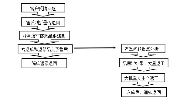 2 針對客戶反饋的問題需要返回的,需跟業(yè)務員交流,根據發(fā)貨時間 數量 問題所在,并且讓業(yè)務員填寫《客退品跟蹤單》《糾正預防措施報告》,進行分析評估,根據數量的多少問題的輕重來決定是否該返生產線進行第二次生產加工。少量(5`15套分類)的自行維修處理。處理好后,填寫單據簽字,業(yè)務員跟客戶溝通后直接返回客戶手中。