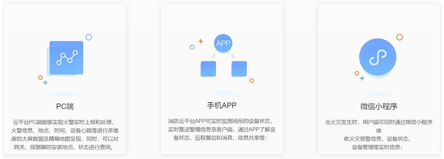 ![]() | 系統(tǒng)架構(gòu) 城中村火災(zāi)防控系統(tǒng)基于NB-IoT無線網(wǎng)絡(luò),運(yùn)用物聯(lián)網(wǎng)、移動互聯(lián)網(wǎng)、大數(shù)據(jù)、云計(jì)算技術(shù),實(shí)時監(jiān)控區(qū)域內(nèi)消防設(shè)備/設(shè)施運(yùn)行狀態(tài),當(dāng)發(fā)生火災(zāi)警情,可通過云平臺實(shí)時彈窗、自動語音電話、手機(jī)APP/小程序信息推送通知消防單位、及管理人員/用戶等,具有發(fā)現(xiàn)警情早、告警流程簡單、早處理等功能,有效解決校園場所消防監(jiān)督管理難點(diǎn)。 |