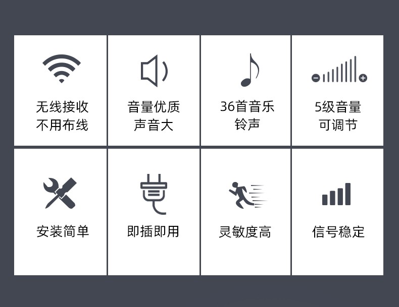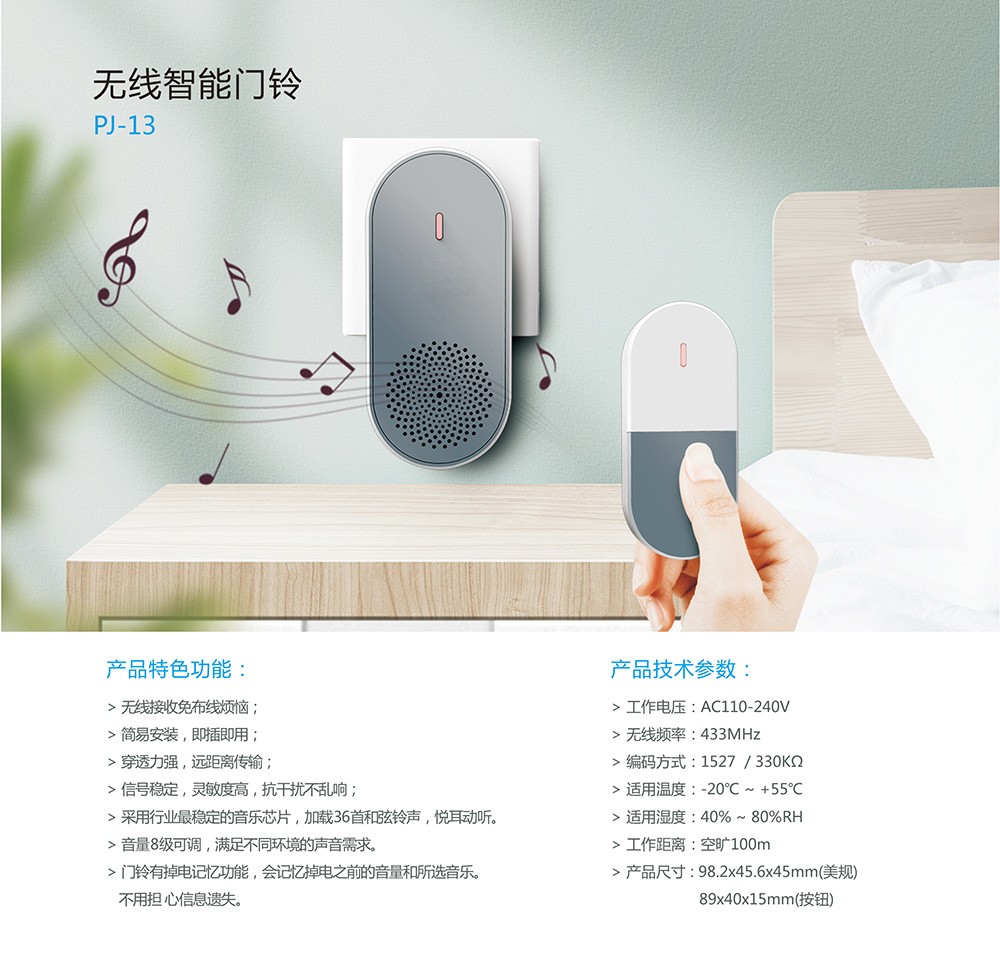 門鈴有掉電記憶功能,會(huì)記憶掉電之前的音量和所選音樂。不用擔(dān)心信息遺失。