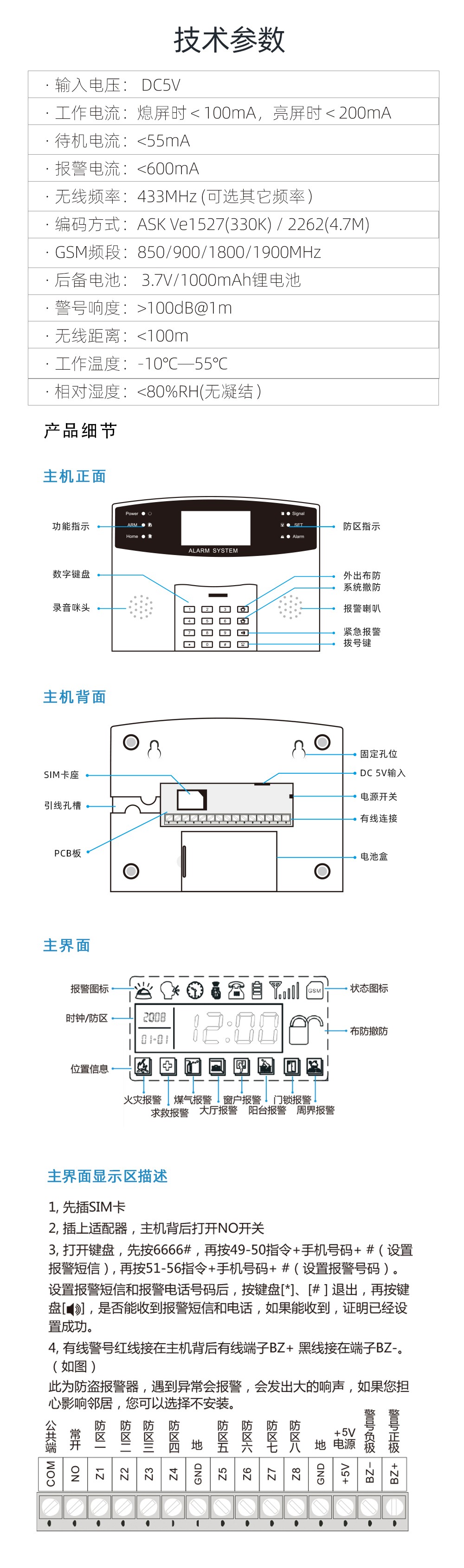 預(yù)設(shè)6組報(bào)警電話,主機(jī)自動(dòng)撥打電話語音報(bào)警;